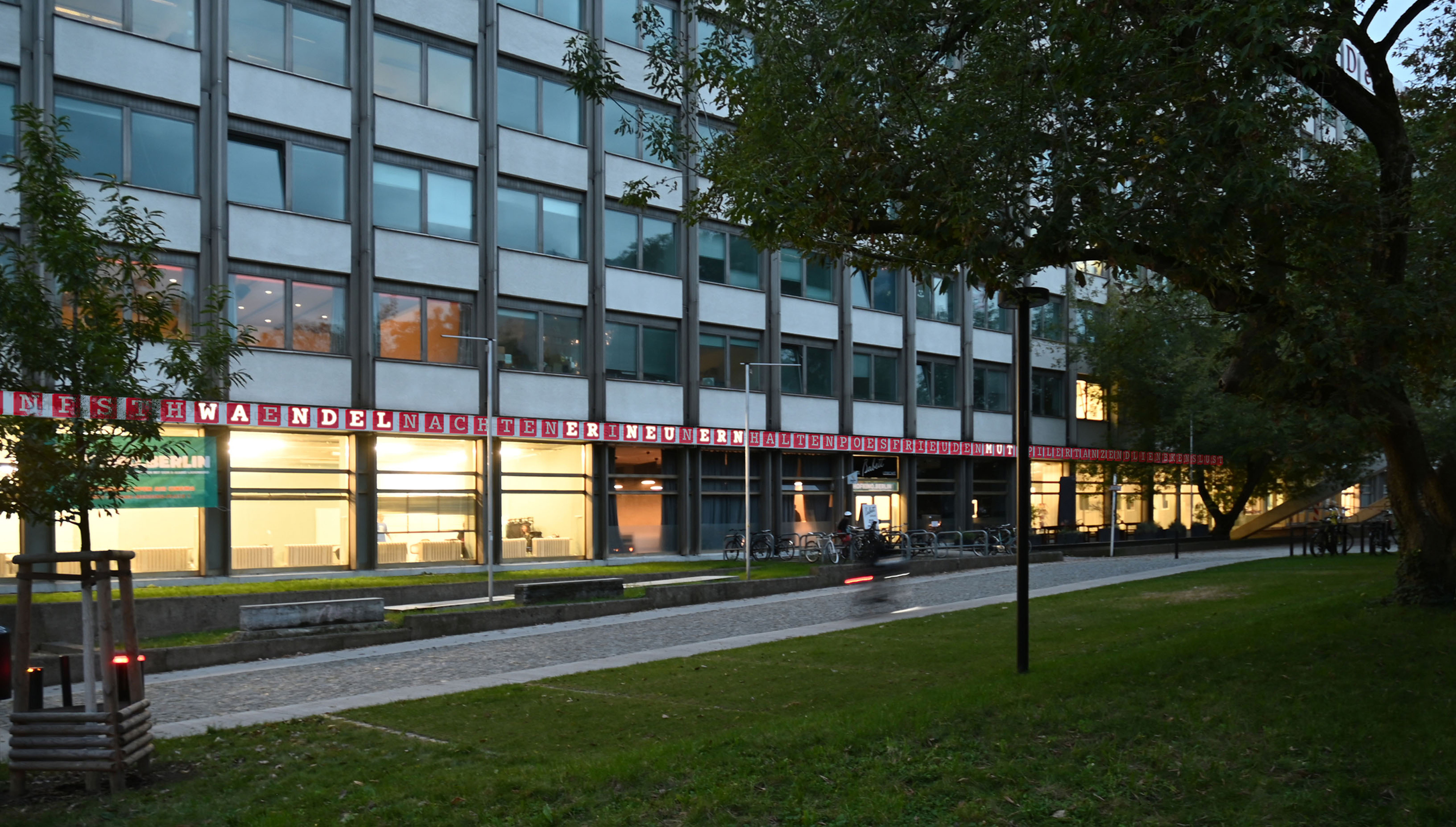 The 2011 installed strip of lettering with quotes from Rosa Luxemburg, Peter Weiss and Karl Marx will be replaced by a sequence of letters that at first glance appear cryptic. Words and syllables are interlocked and can only be partially read without lighting.The words, alternately highlighted by backlighting, describe wishes and visions for a NEUES LAND (NEW COUNTRY). On the left-hand side of the façade, words ranging from FUTURE to LUST are illuminated, on the right-hand side from HUMAN to DREAM.